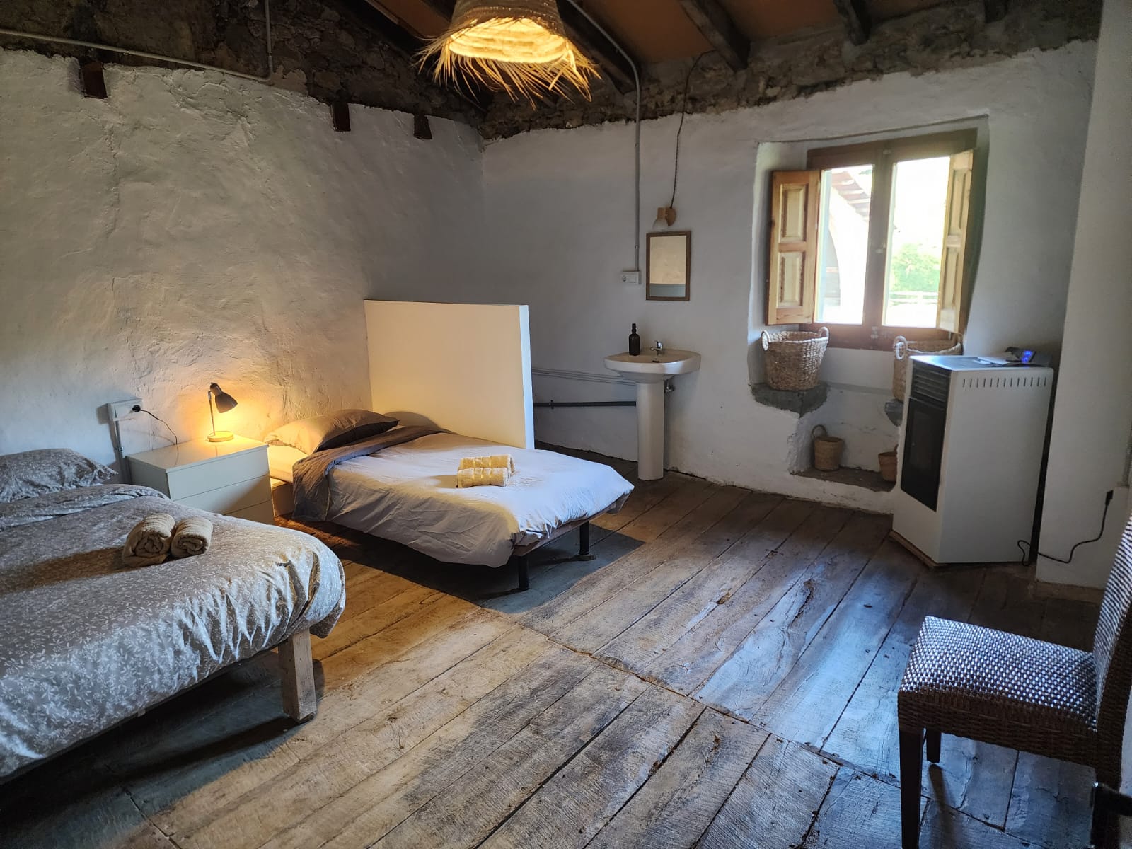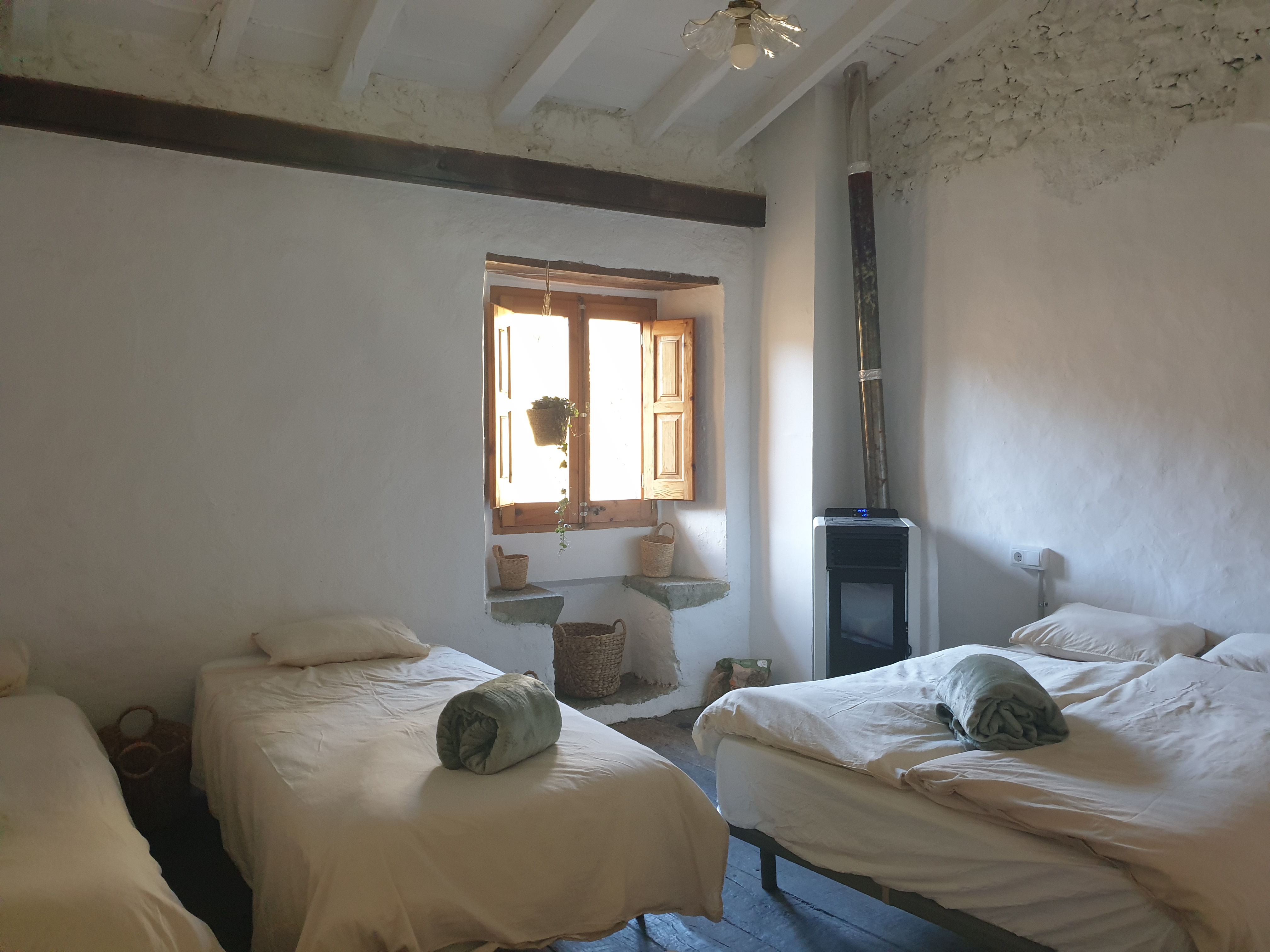 Habitación con cama dobe y dos individuales. Estufa de pelets. Orientanción este.